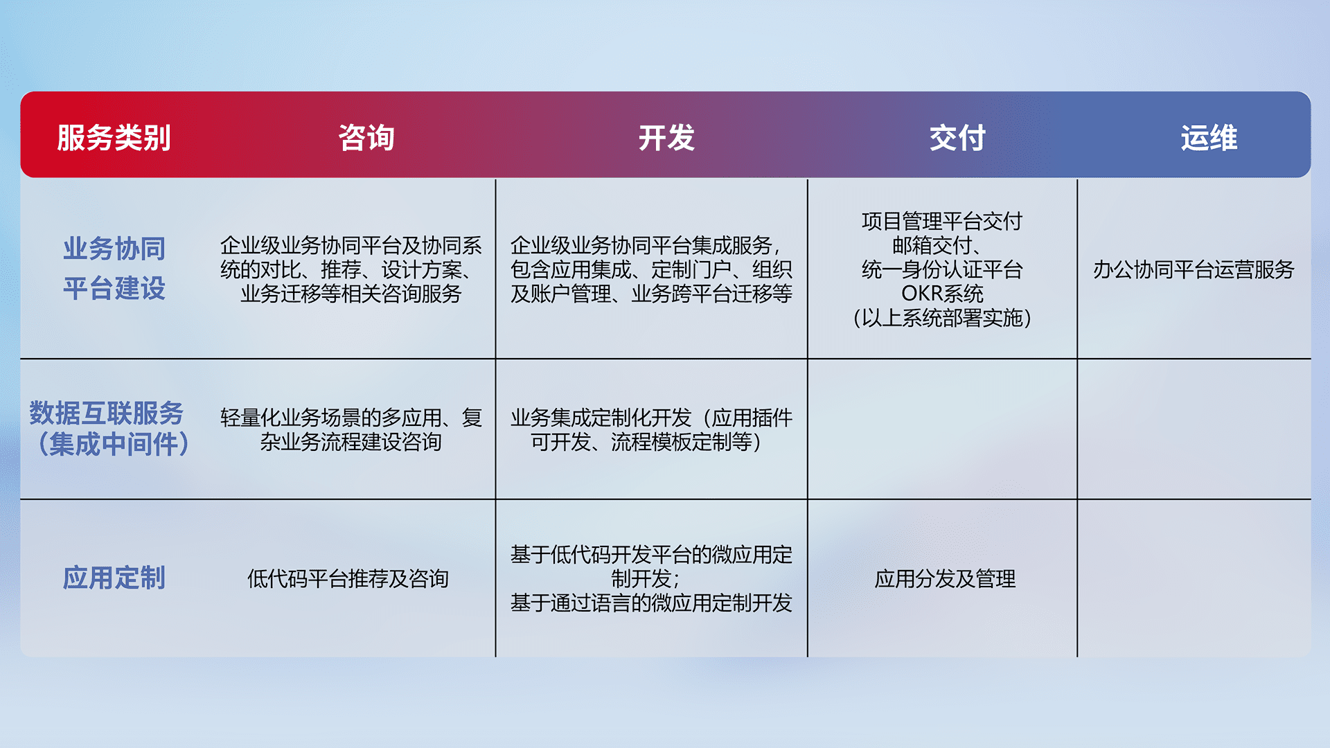 针对钉钉、、企微、、、、IDaas等平台级产品提供产品的规划、、、、方案、、交付、、、、定制化开发等服务,,实现如统一协同办公、、、、智能客户服务、、、混合会议管理、、智能数据查询、、、等业务场景,,,实现数字化转型。。。